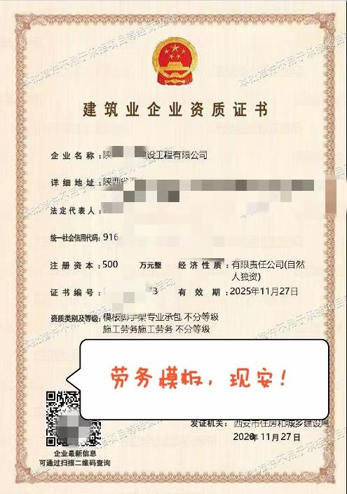 劳务模板稀缺货,仅此一套。另出陕西建筑资质各类搭配,需要老板来谈