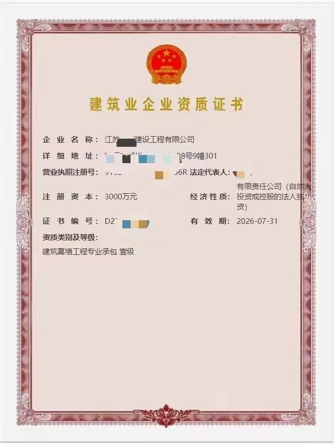 出售:施工专业承包-建筑幕墙工程专业承包资质一级 我要举报